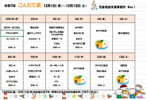 本⽇の給⾷、活動報告、イベント、お休みのご案内、療育コラムなどこちらのお知らせより発信していきます。