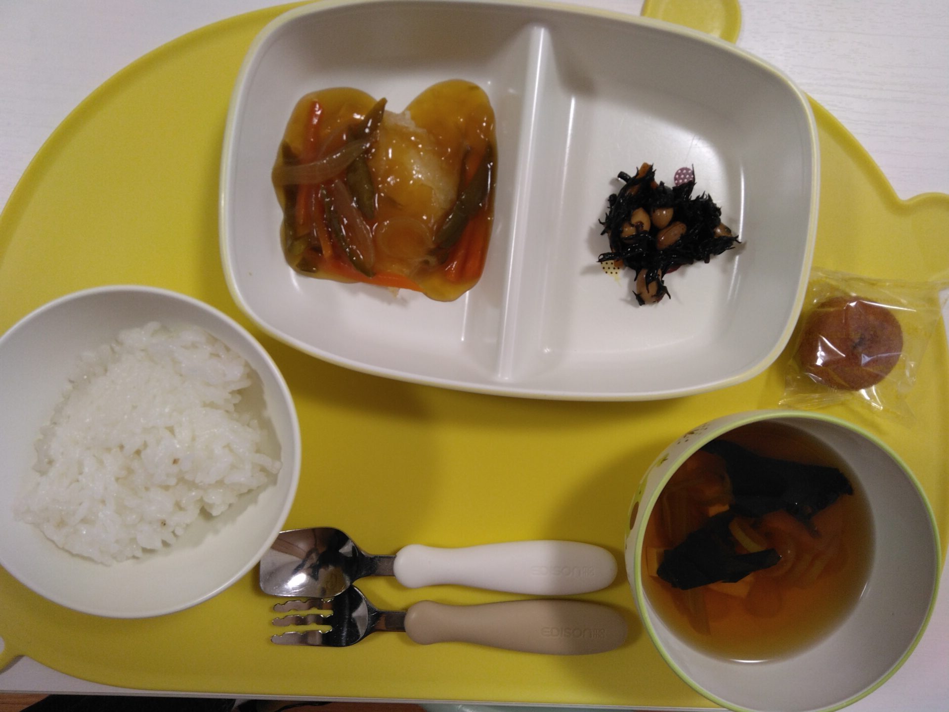 今日の給食は、魚の野菜あんかけ・ひじきの煮物・すまし汁・ごはん・デザートでした。