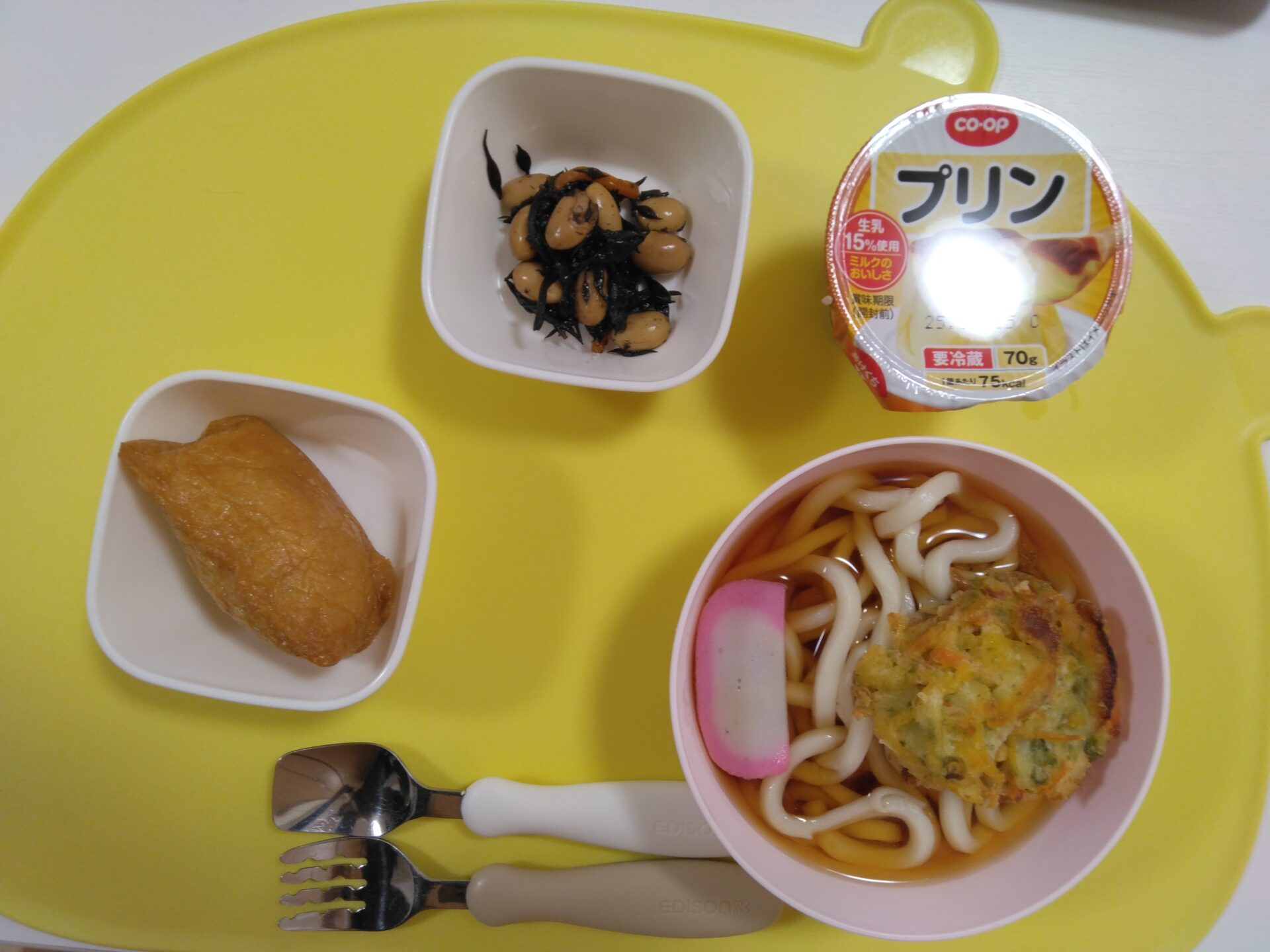 今日の給食は、かき揚げうどん・いなり寿司・ひじき煮・デザートでした。
