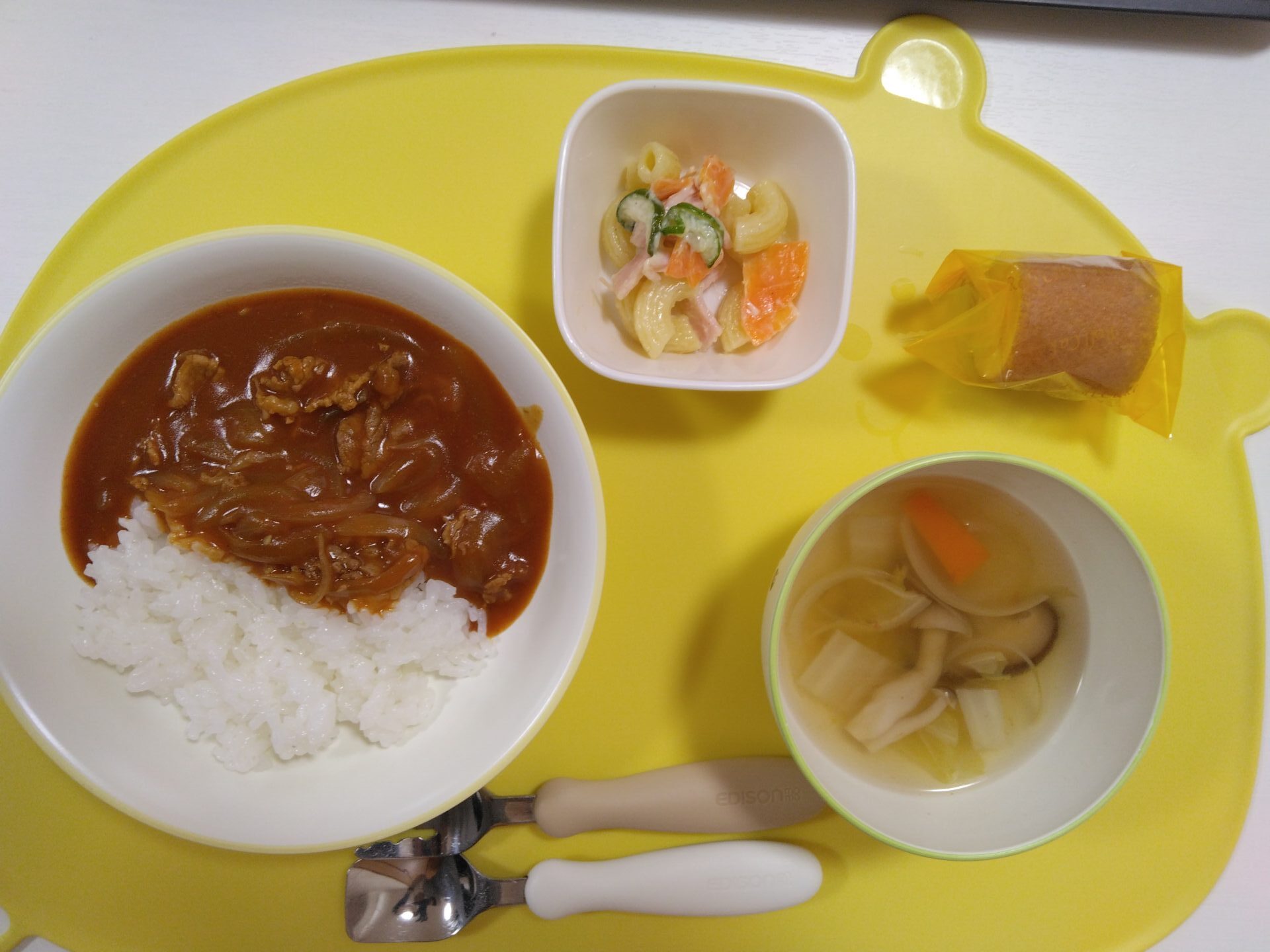 今日の給食は、ハヤシライス・マカロニサラダ・野菜スープ・デザートでした。