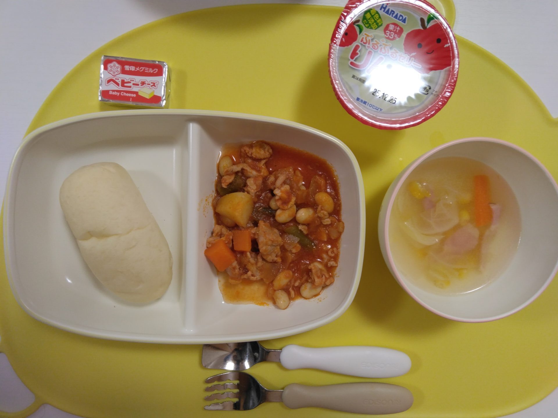 今日の給食は、ポークビーンズ・コンソメスープ・チーズ・パン・デザートでした。