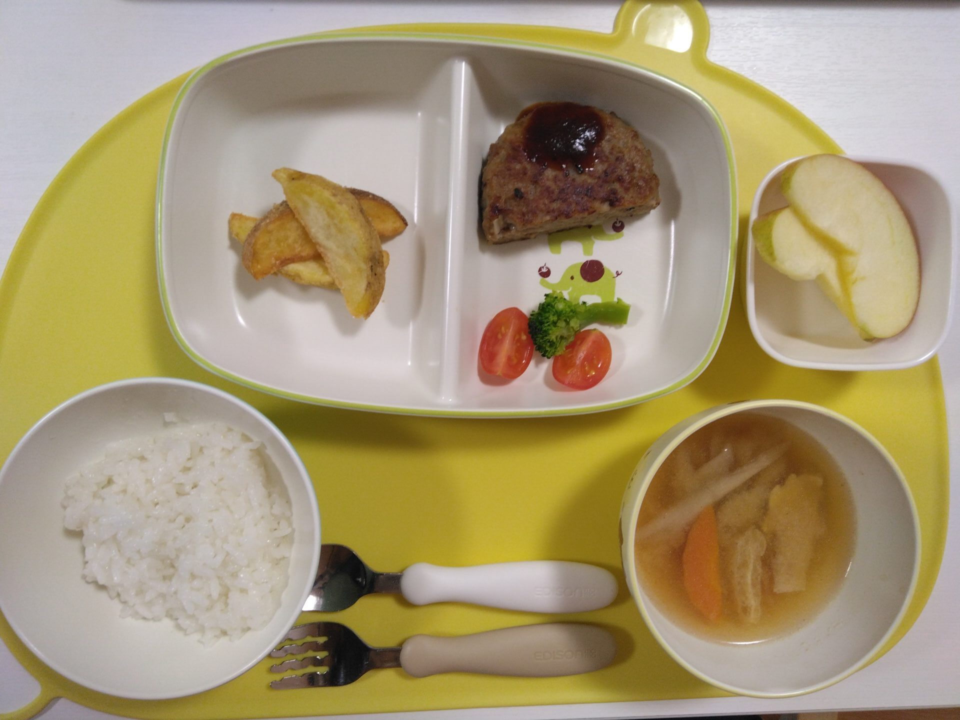 今日の給食は、ごはん・ハンバーグ・ポテトフライ・みそ汁・デザートでした。