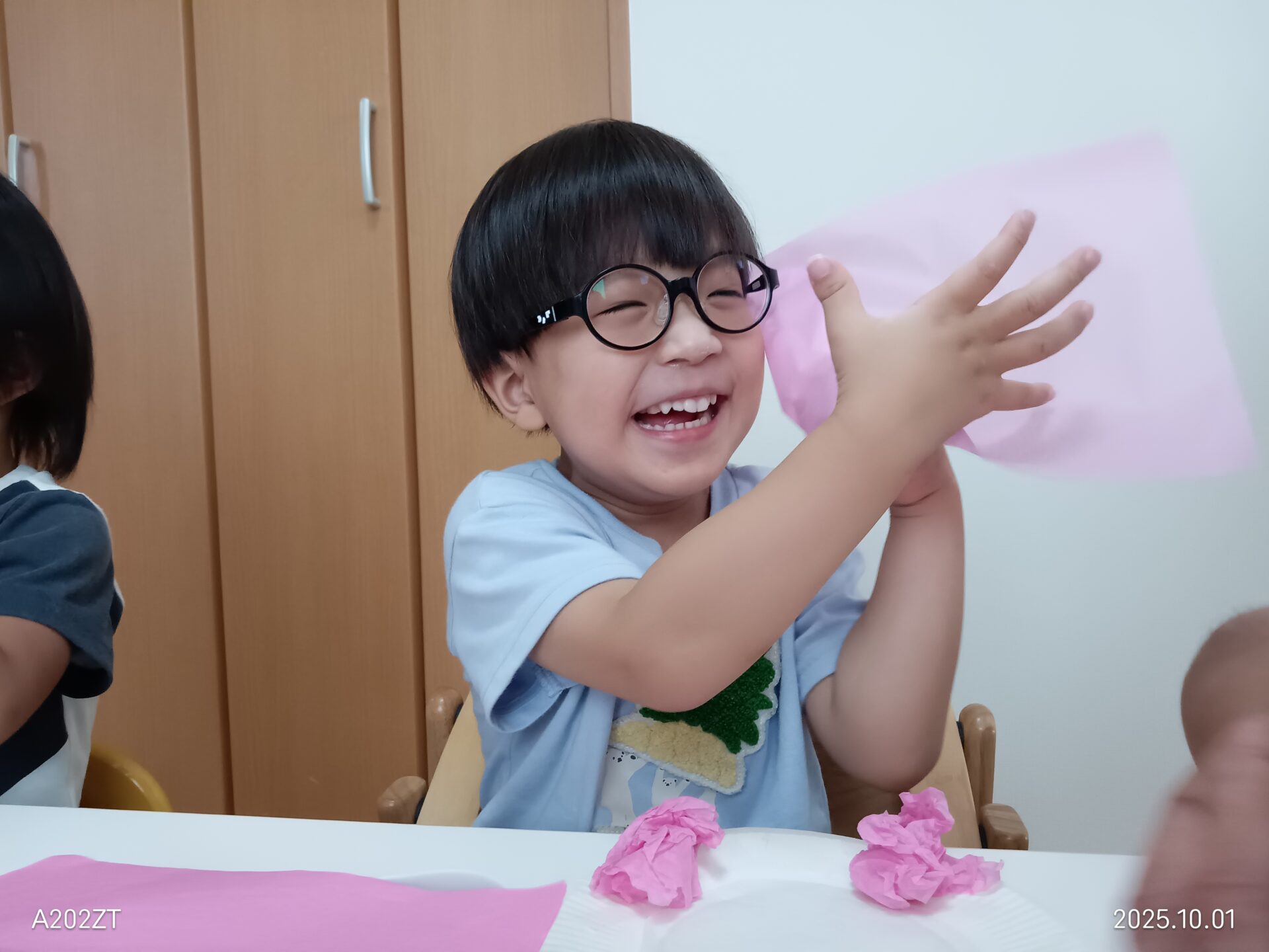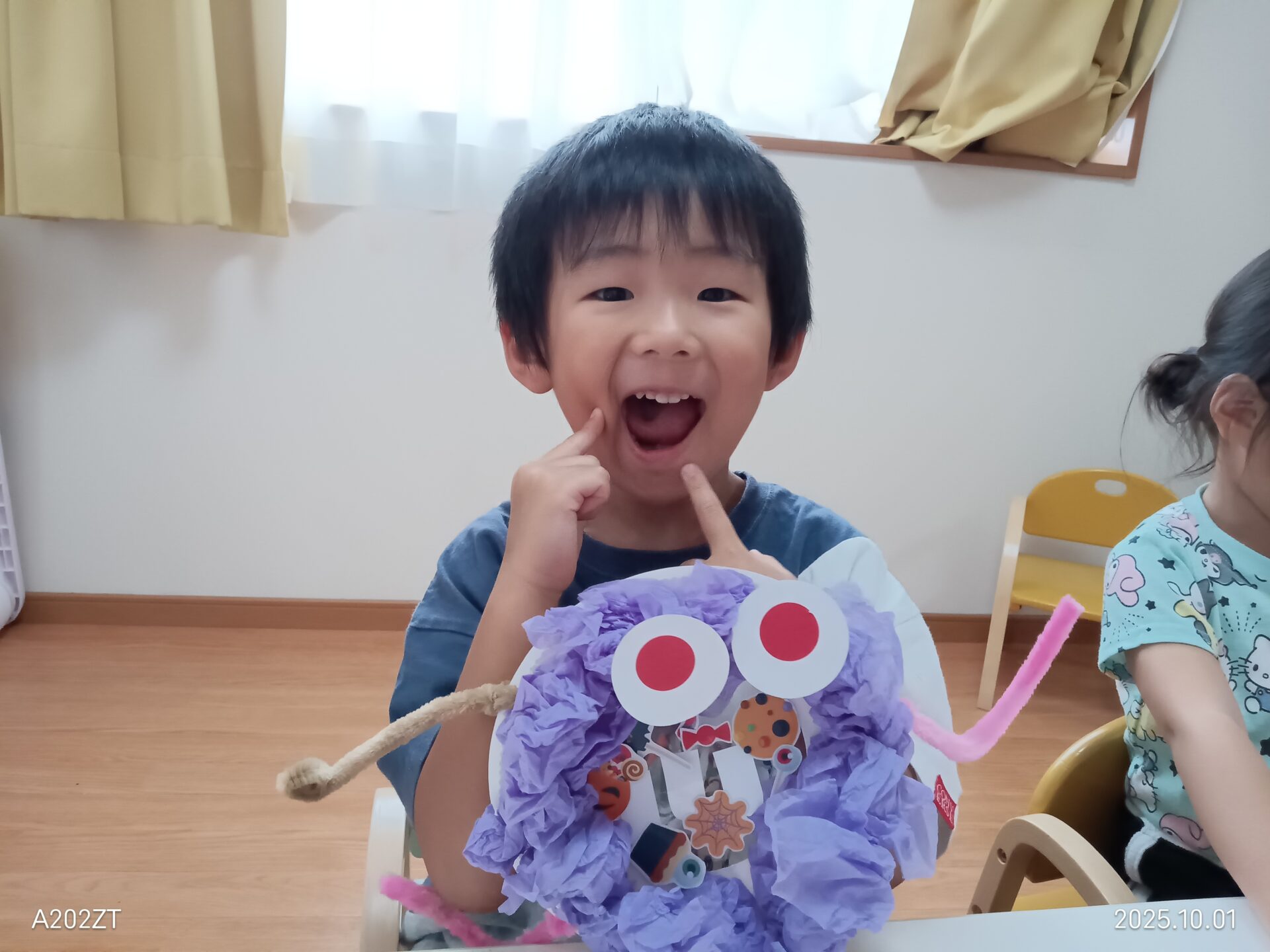 子どもたちはお花紙をぎゅっと丸め、目や歯を貼ってモンスターにあげるお菓子を選びました☺