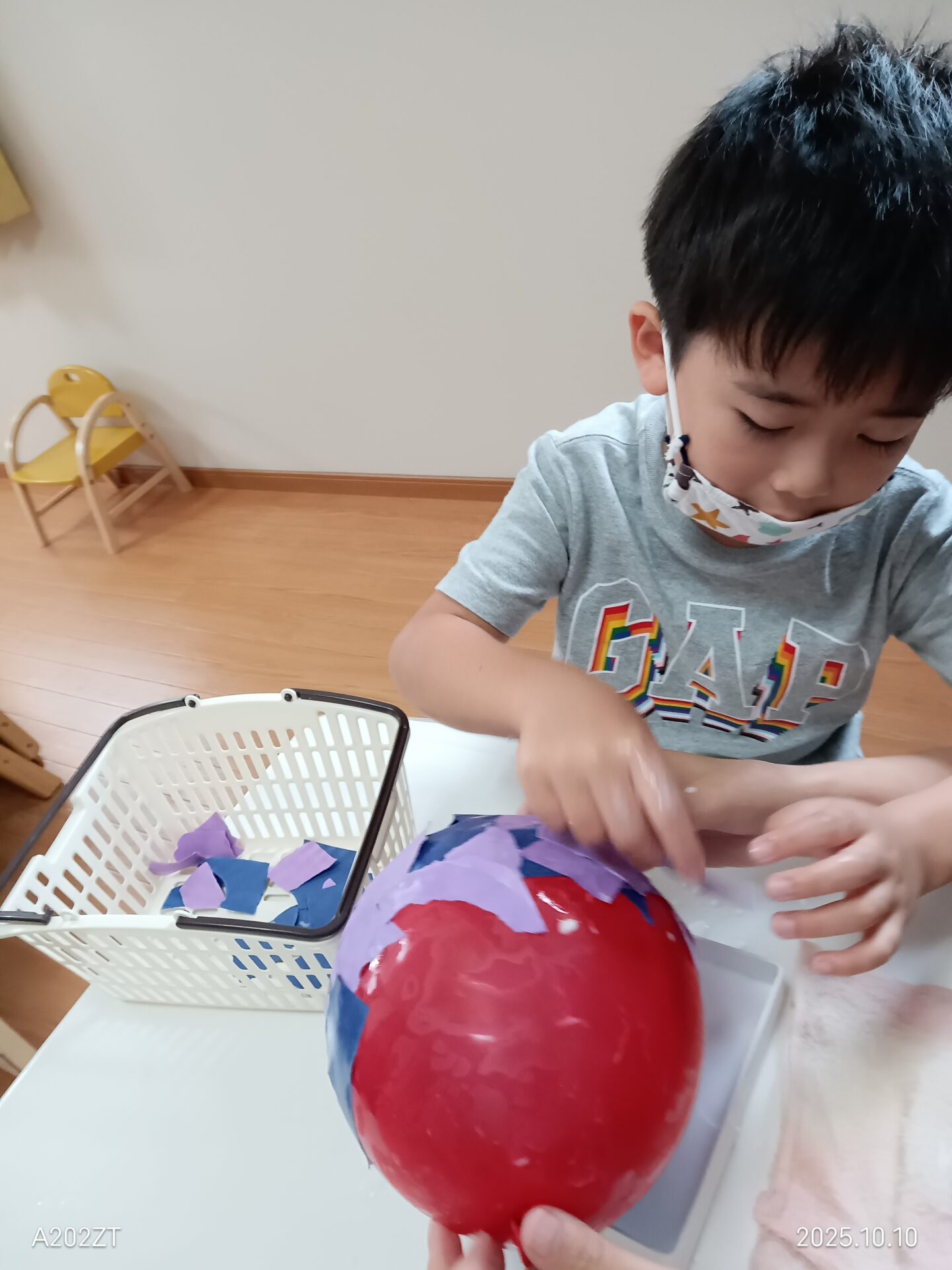風船の周りに画用紙を貼っていき、乾いた後に好きな顔を選んで貼り完成!!