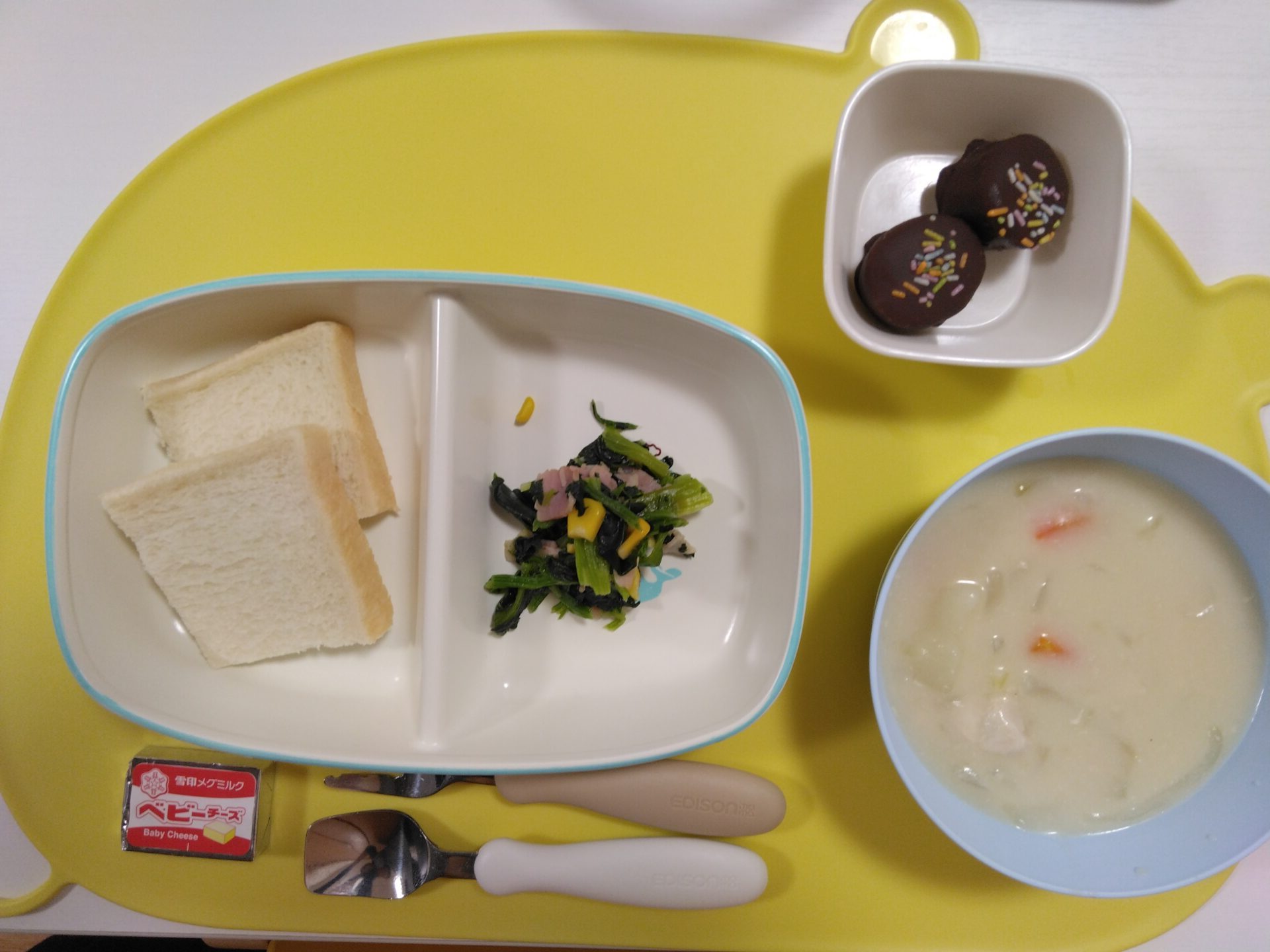 今日の給食は、クリームシチュー・ほうれん草ベーコン・チーズ・食パン・デザートでした。