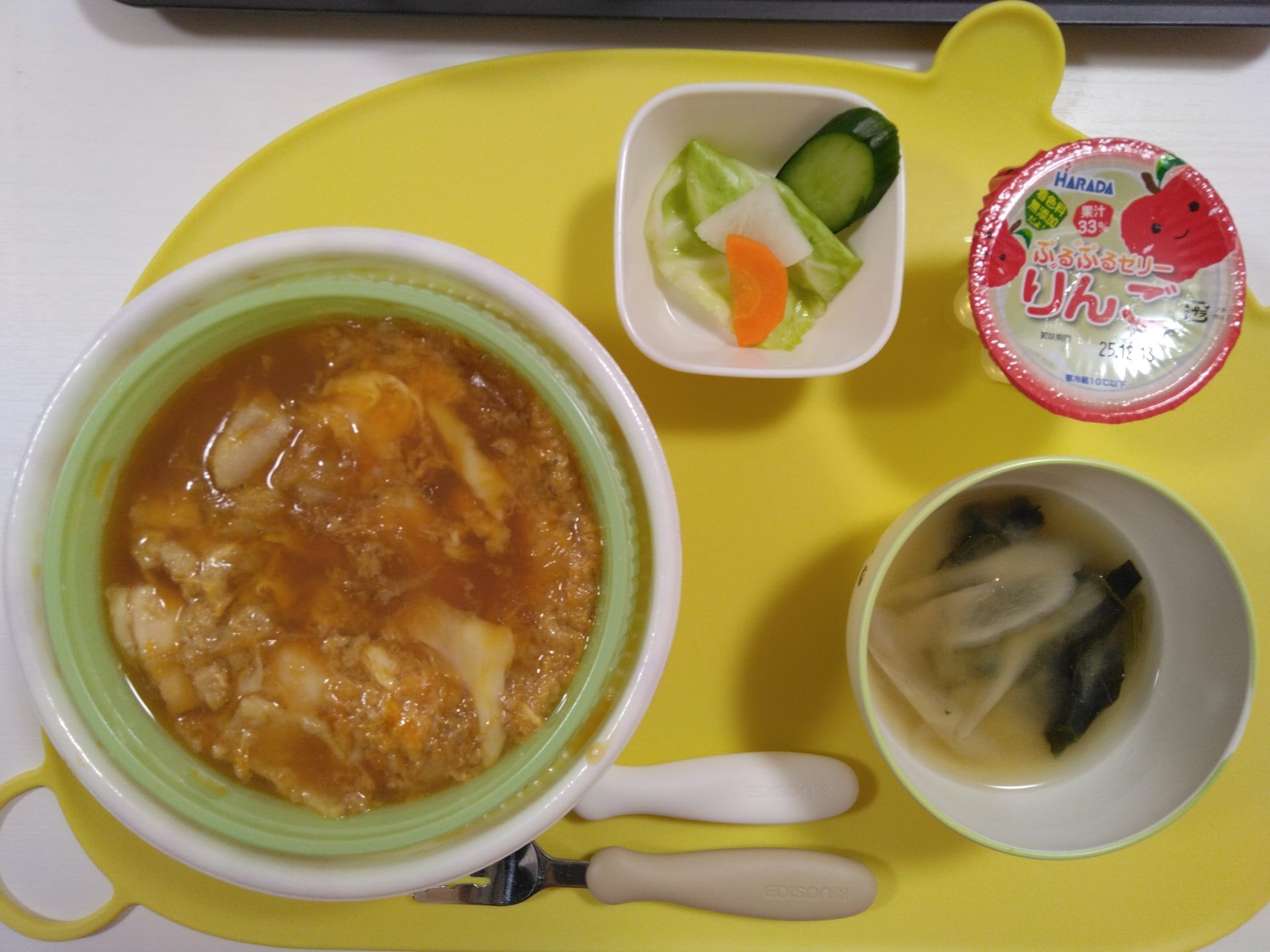 今日の給食は、親子丼・いろいろ野菜のお漬物・みそ汁・デザートでした。