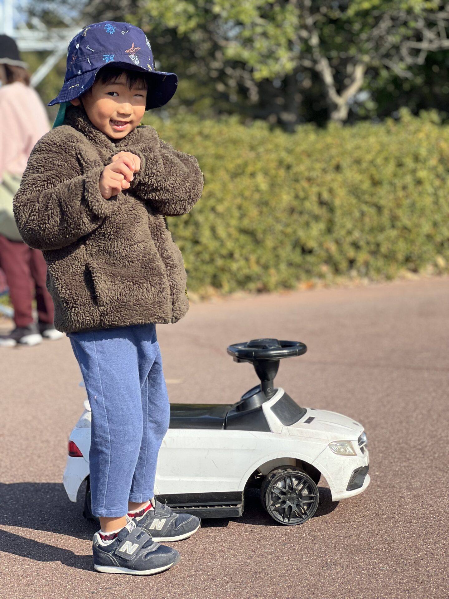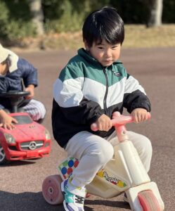 地面を蹴りながらすいすい進み、友だちと向かい合うと上手にハンドルを回して方向転換をしていました👏
