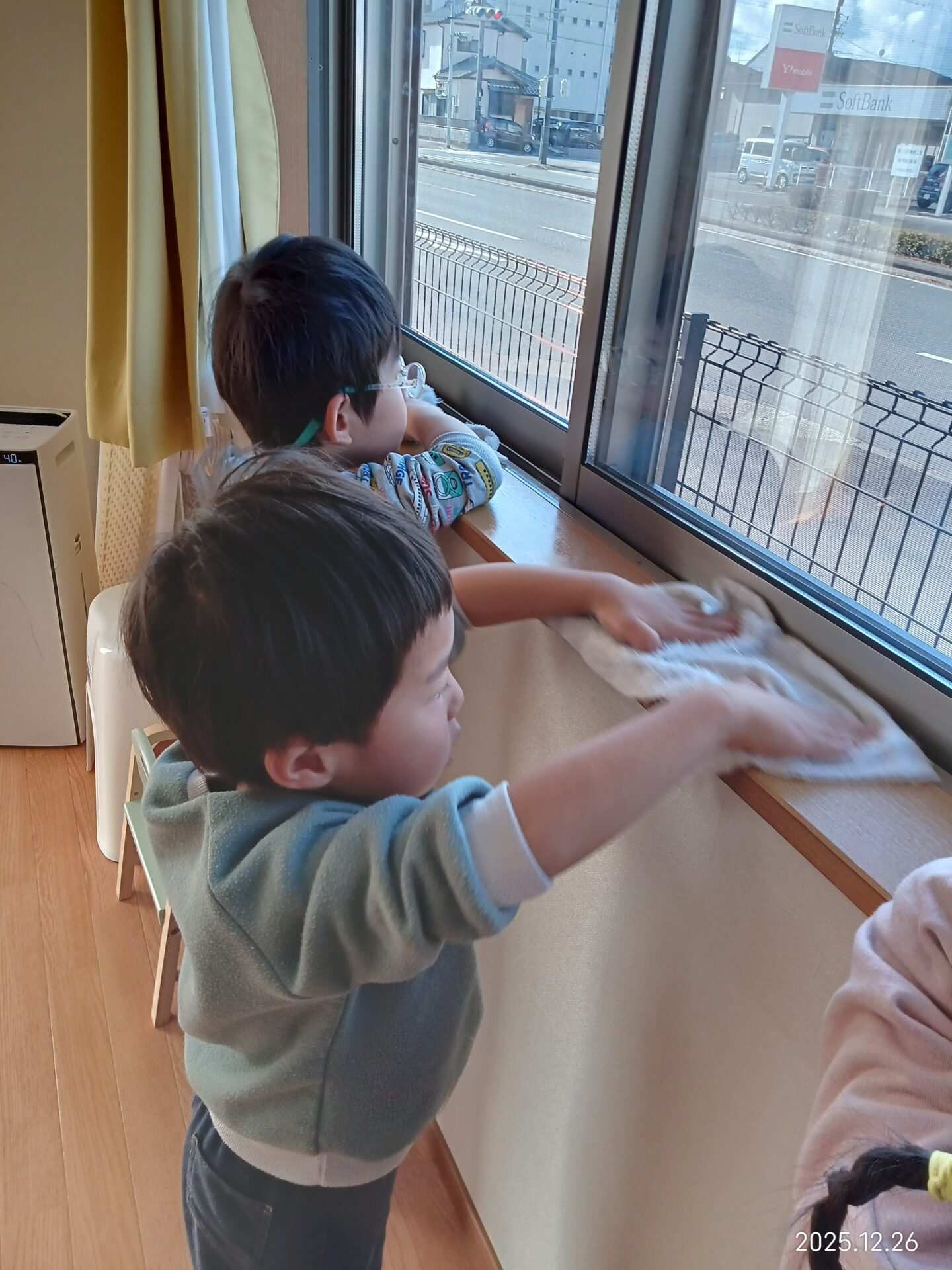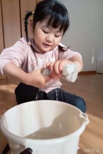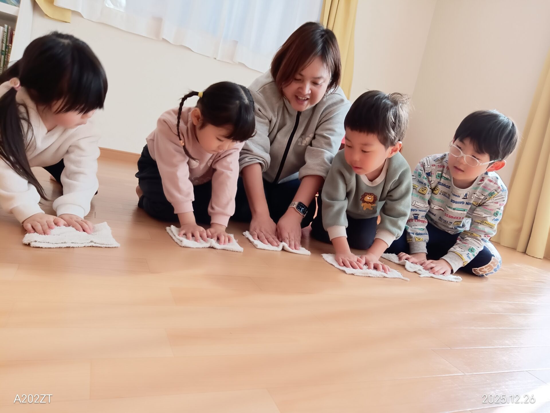 初めて雑巾を触る子もいましたが、少しずつ慣れてくると自分から色々なところを拭いてくれました♪