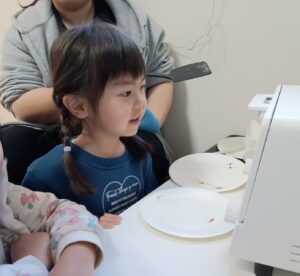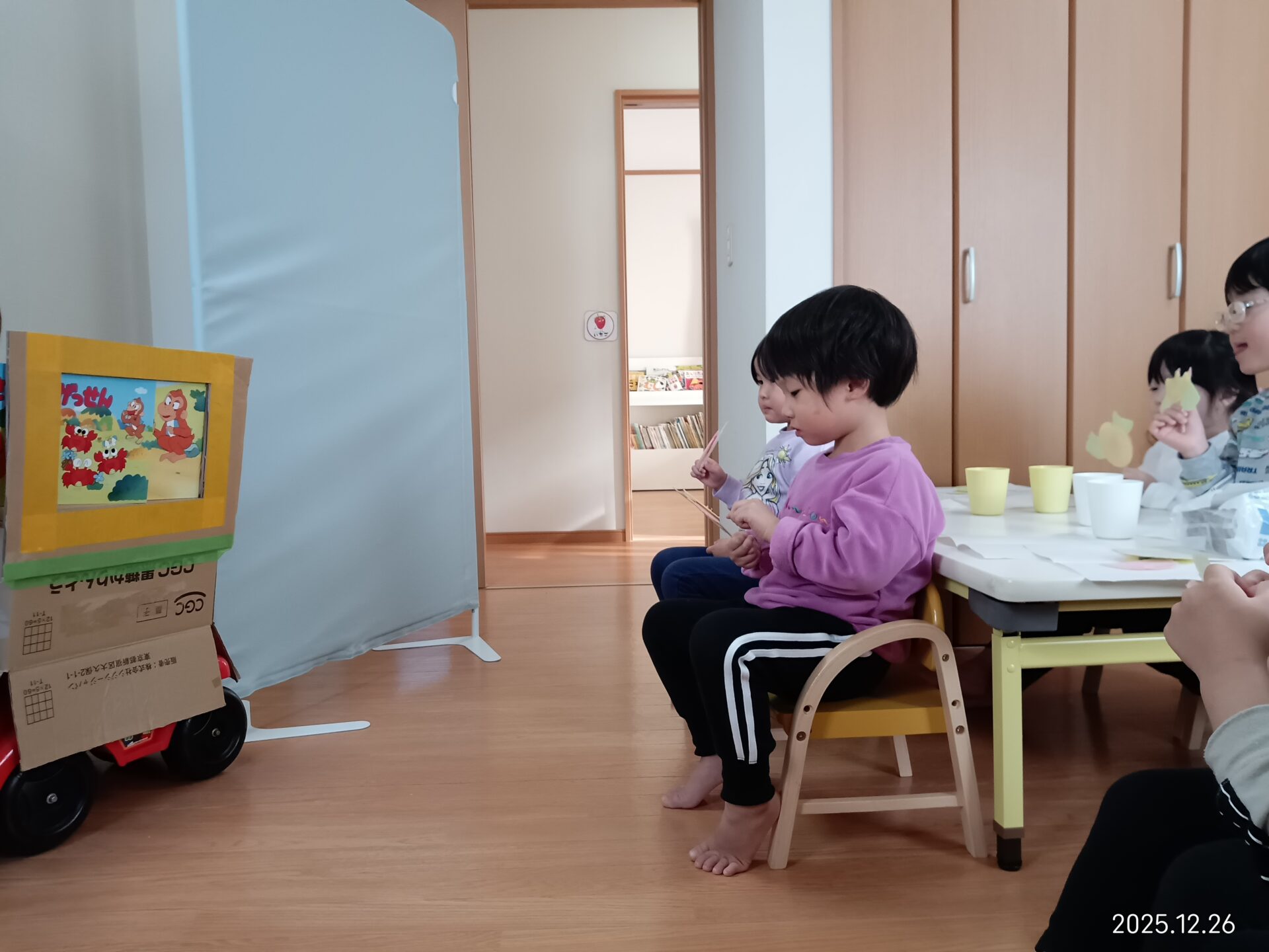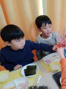 午後には紙芝居屋さんがきてくれて水あめを食べながら「かちかち山」の紙芝居を見ました♪